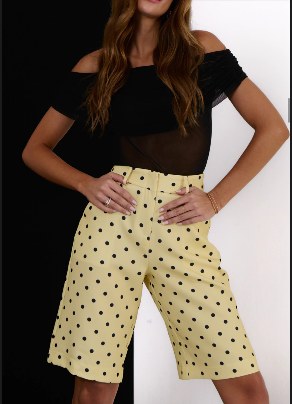 Bermuda confeccionada em crepe alfaiataria com estampa de poá, nervuras verticais, bolsos laterais, passante e fechamento frontal com zíper comum.
