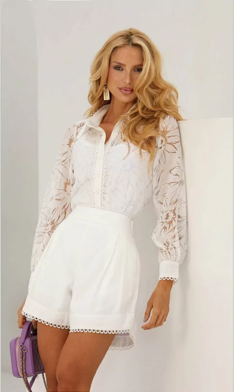 A camisa, confeccionada em tecido estruturado com estampa devorê, é uma peça que une sofisticação e charme em cada detalhe. A peça possui shape tradicional e mangas bufan- tes, que adicionam um toque moderno e romântico. O diferencial está na delicada aplicação de renda guipir nos punhos, gola e patê, que eleva a camisa a um nível de refinamento único. A textura devorê reforça o romantismo e traz um estilo atemporal, com detalhes que fazem a diferença.