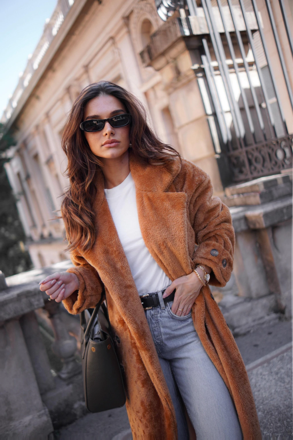 O casaco Eva é confeccionado em pelo sintético com toque macio e possui comprimento longo.
