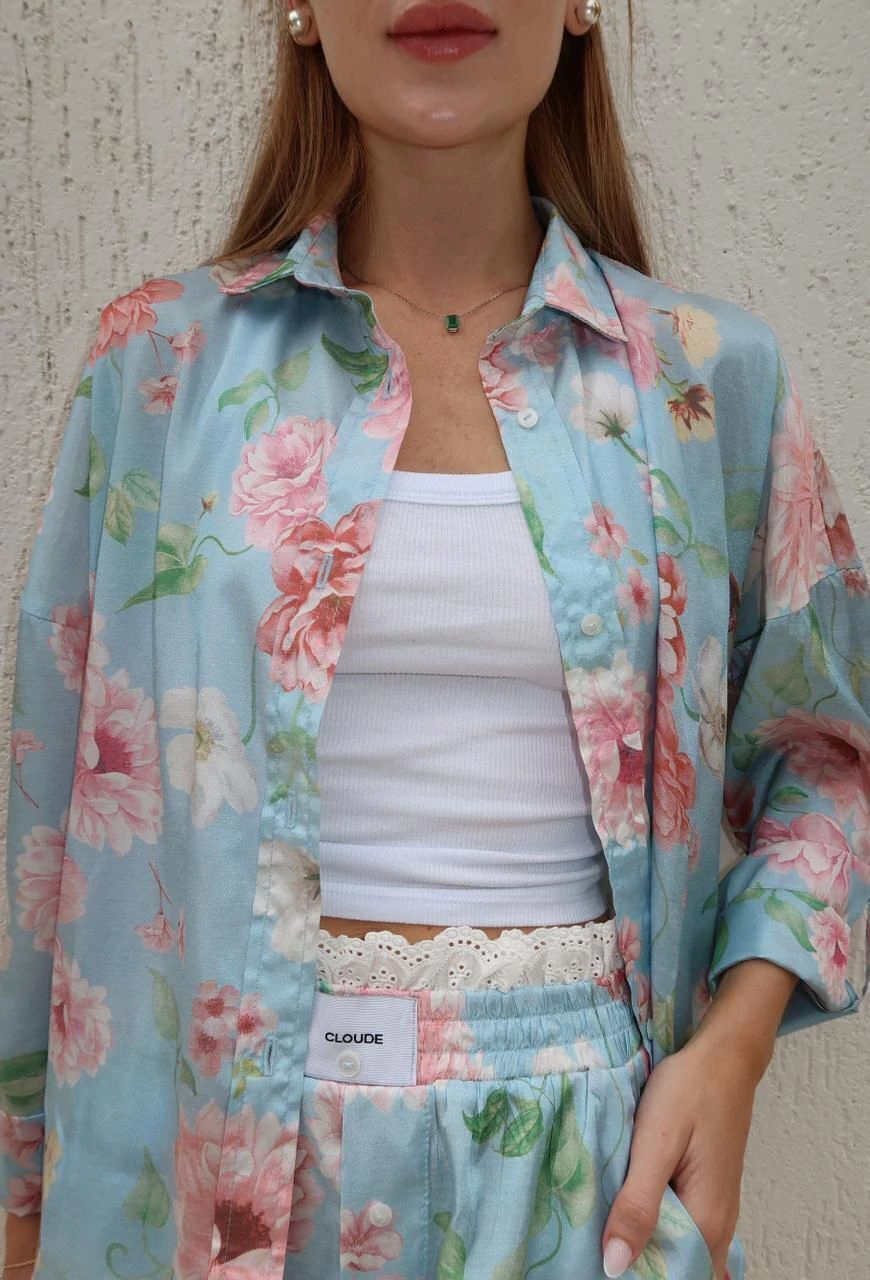 O conjunto Paola é confeccionado em sarja é composto por short e camisa.