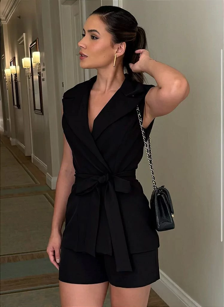 Conjunto Blaser estruturado com ombreiras e bermuda com corte em alfaitaria feminina!