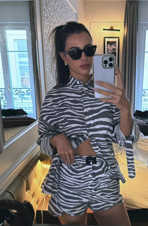 O conjunto Drica é confeccionado em crepe é composto por short e camisa.