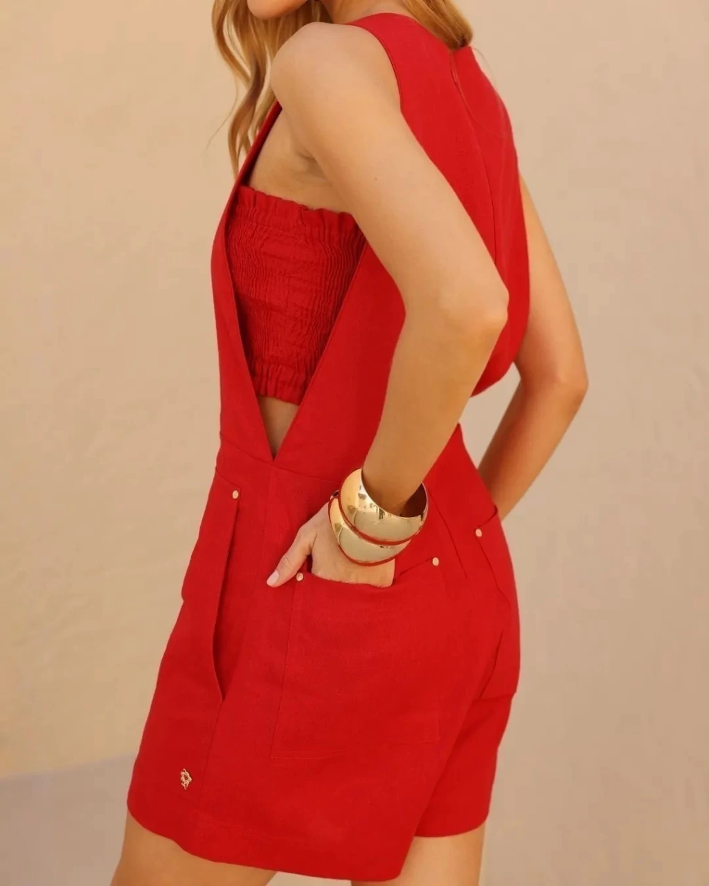 Macacão Vermelho em Linho com Viscose. Shape acinturado, cavado, decote redondo, bolsos sobrepostos, pespontos e fechamento em zíper costas. Acompanha top laxtex. Ideal para usar com sandálias ou tênis. Look Basic Versátil.