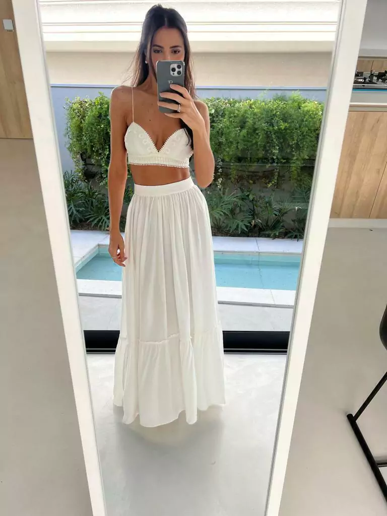 A saia Isla é confeccionada em crepe e possui comprimento longo.