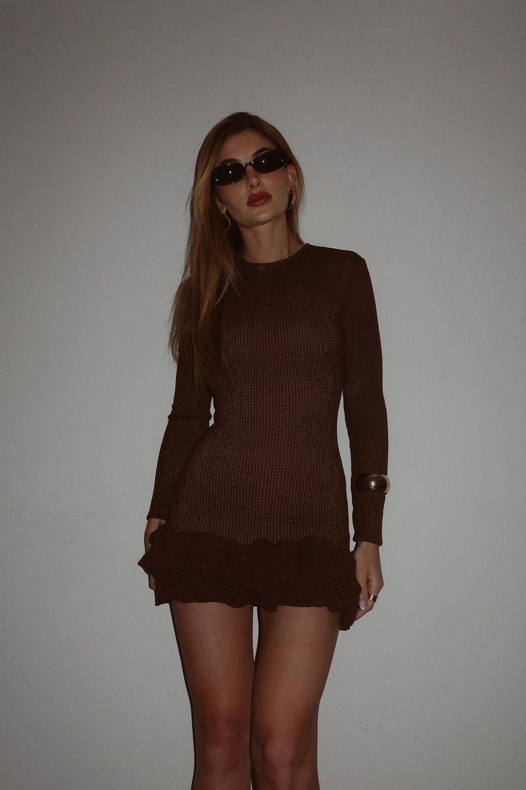O vestido Monike é confeccionado em tricot e possui comprimento curto.